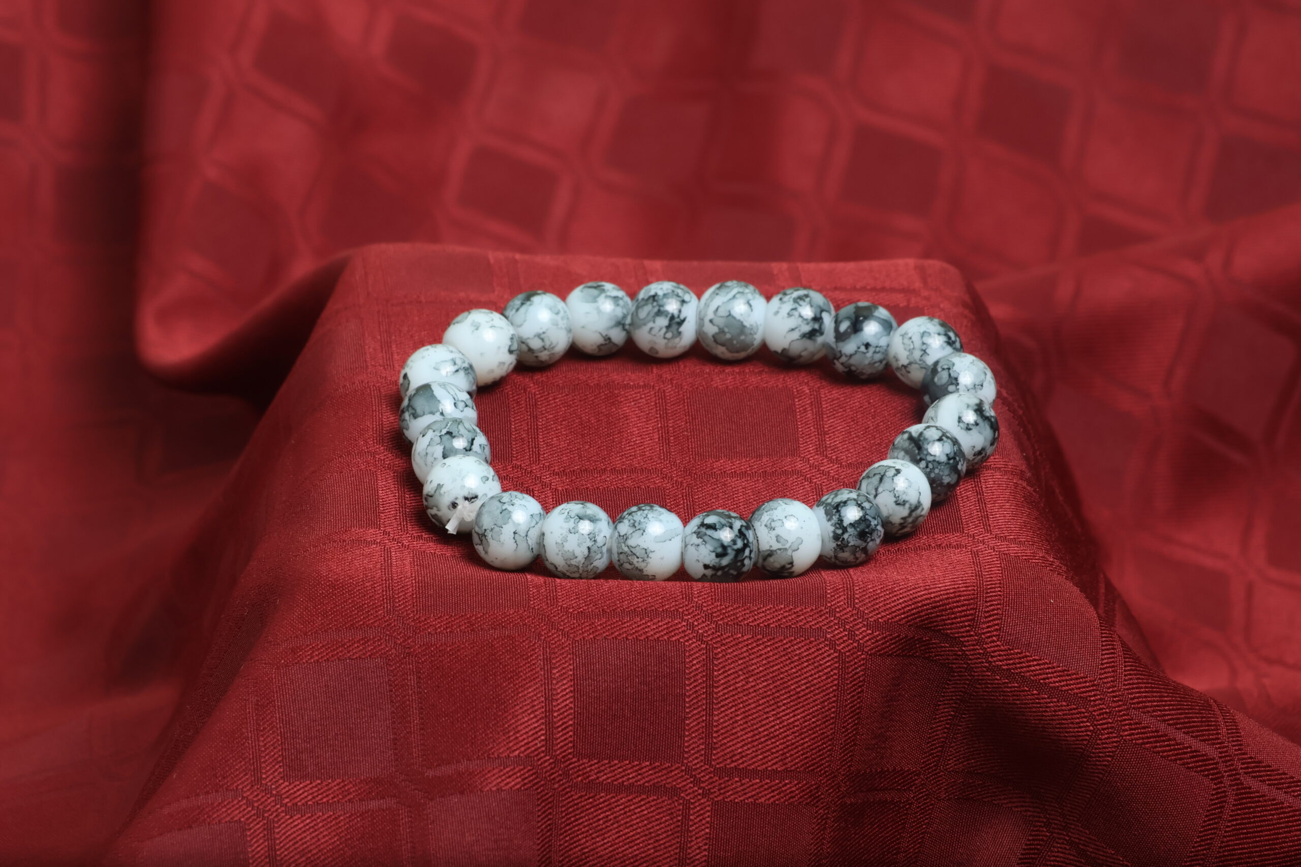 Crafted with high quality synthetic marble-patterned beads, each piece has a unique value and white design that adds a touch of calm and class to your wrist.